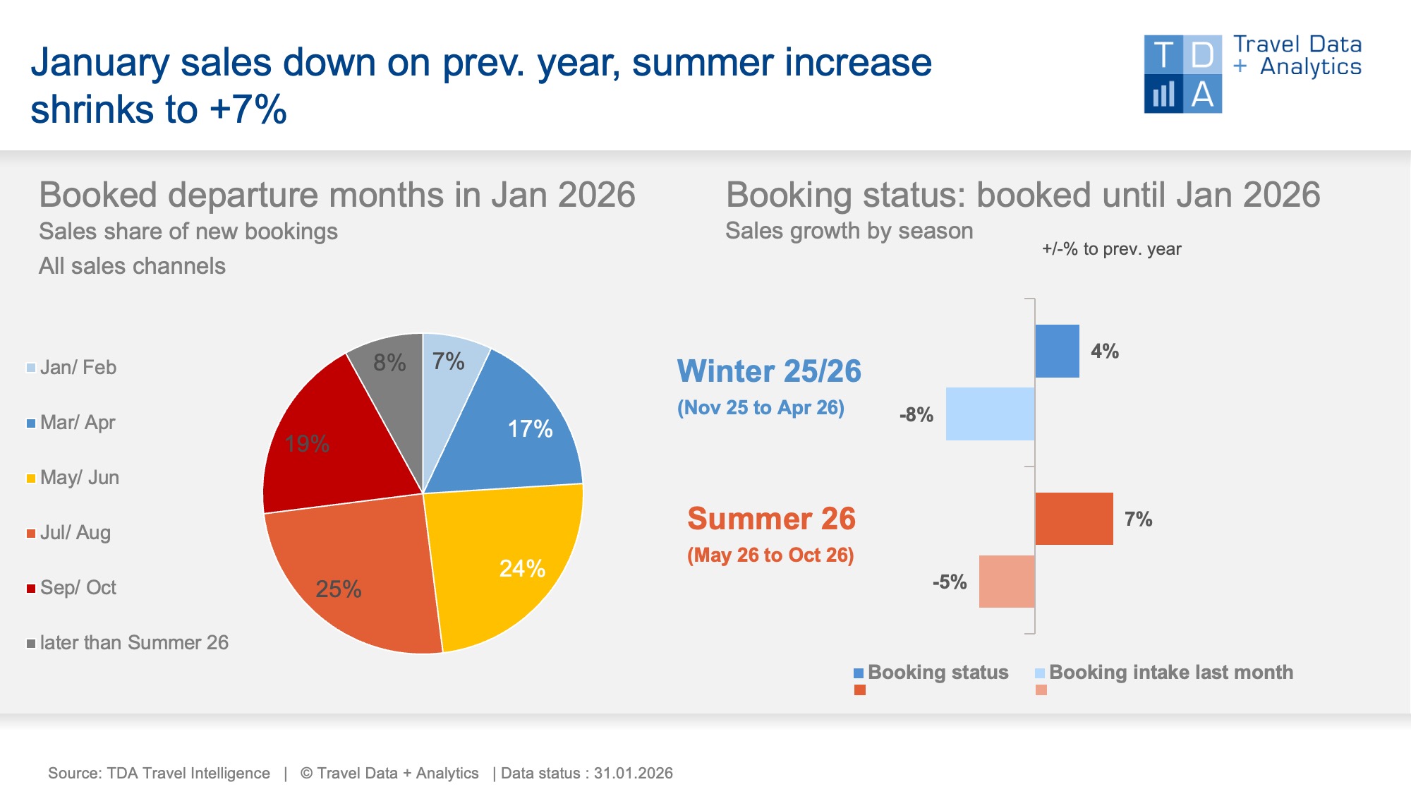 Nuremberg, February 26, 2026 – January is traditionally the strongest booking month of the year in the holiday travel business. This year, however, it was comparatively weaker: booked travel revenues for summer holidays in 2026 were 5 percent below the prior year’s level, and booking intake for winter holidays in the current season was 8 percent lower than in January 2025. The declines should not be interpreted as a sign of reduced travel appetite among Germans. Rather, they result from an unusually strong early-booking segment in the past that had previously boosted growth. With this year’s January correction, the cumulative seasonal balances are shrinking but remain positive: the winter season shows a 4 percent revenue increase, and the upcoming summer season still has 7 percent higher revenues compared with last year.