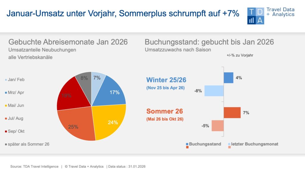 Nürnberg, 26. Februar 2026 – Der Januar ist im Urlaubsreisegeschäft traditionell der buchungsstärkste Monat des Jahres. In diesem Jahr fällt er allerdings schwächer aus: Die gebuchten Reiseumsätze für diesjährige Sommerurlaube liegen 5 Prozent unter dem Vorjahresniveau, die Buchungseingänge für Winterurlaube in der laufenden Saison sogar um 8 Prozent. Die Rückgänge sind jedoch kaum als Ausdruck nachlassender Reisefreudigkeit der Bundesbürger zu werten. Sie sind vielmehr vorgezogenen Frühbuchern geschuldet, die zuvor für starke Wachstumsquoten gesorgt hatten. Mit dem diesjährigen Januar-Korrektiv schmilzen die kumulierten Saisonbilanzen zwar ab, bleiben aber positiv: Die Wintersaison steht bei einem Umsatzplus von 4 Prozent, die anstehende Sommersaison weist 7 Prozent höhere Umsätze im Vorjahresvergleich auf.
